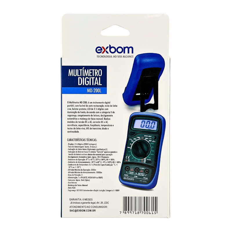 Multímetro Digital Profissional MD-200L — EXBOM (Marca) — Display LCD 3½ Dígitos, 20 Funções, AC/DC, Resistência, Capacitância, Frequência, Temperatura — EAN 7899718700615